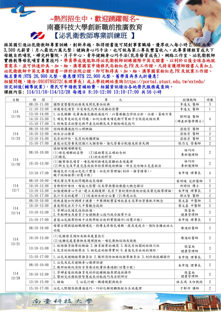 南臺學校財團法人南臺科技大學「泌乳衛教師專業訓練班第1期」課程簡章1份,敬請惠予公告並鼓勵對本課程有興趣者踴躍報名參加,請查照。
