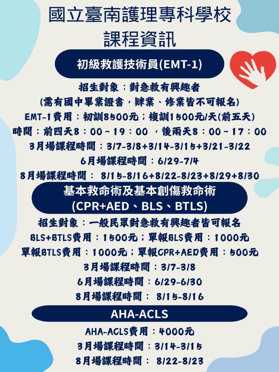 國立臺南護理專科學校辦理115年「ACLS高級心臟救命術訓練研習班」、「ETTC急診外傷訓練研習班」、「EMT-1初級救護技術員研習班」及「BLS-BTLS基本救命術及基本創傷救命術研習班」課程海報,歡迎貴校(院)學生、同仁踴躍報名參加,並惠予公告周知。