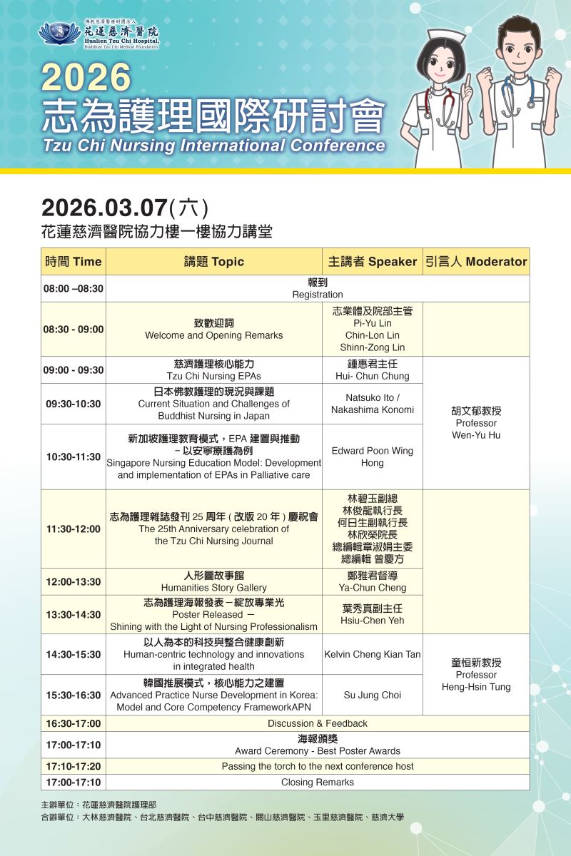 佛教慈濟醫療財團法人花蓮慈濟醫院擬於115年3月7日辦理「2026年志為護理國際研討會」,請惠予公告並鼓勵所屬單位(人員)踴躍報名。