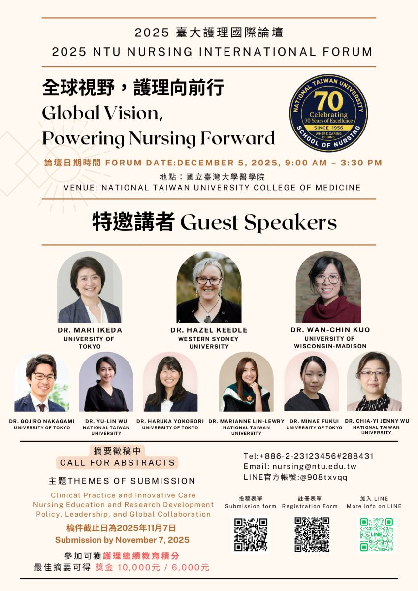 國立臺灣大學敬邀本校護理學系師生及臨床護理人員參與「2025臺大護理國際論壇:全球視野,護理向前行」並踴躍投稿摘要,請查照。