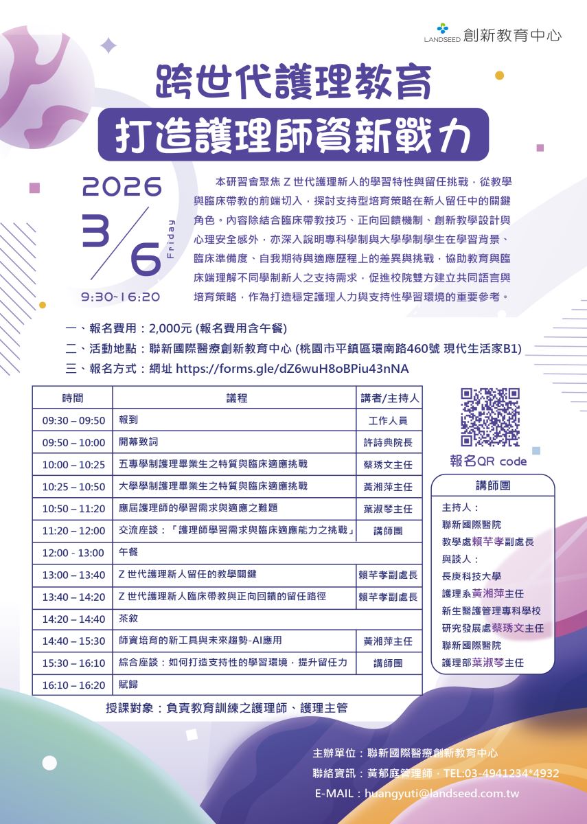 聯新國際醫院 擬於115年3月6日辦理「跨世代護理教育:打造護理師資新戰力」,請惠予公告並鼓勵所屬單位(人員)踴躍報名。