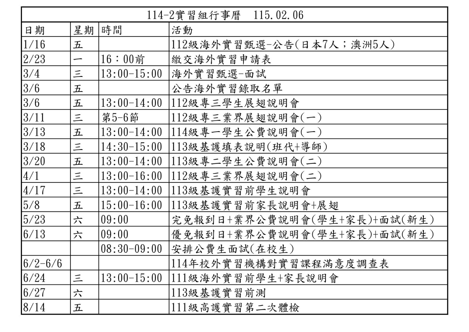 護理科114學年度第二學期活動預告
